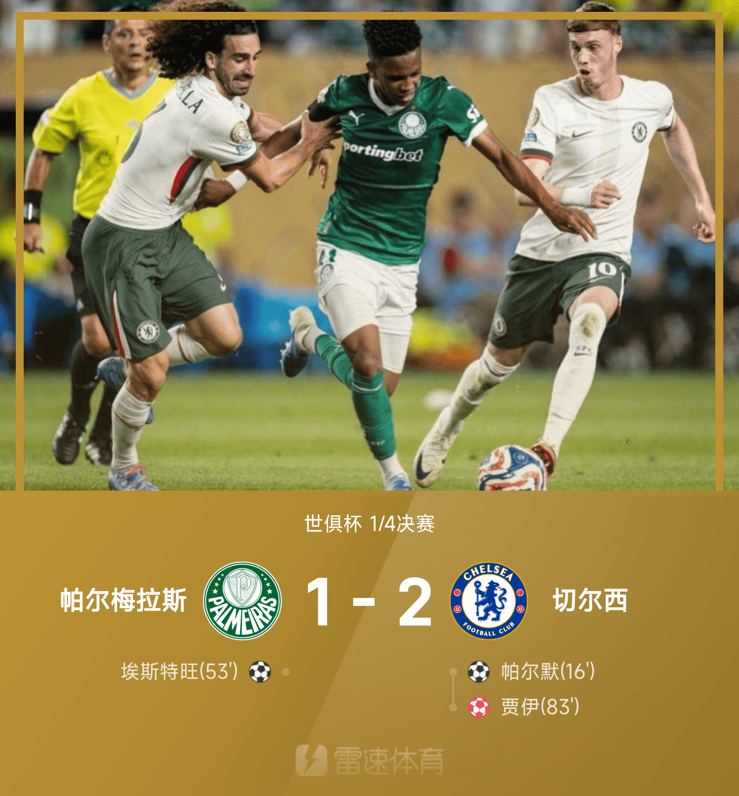 07月05日讯 25赛季世俱杯1/4决赛,切尔西2-1战胜帕尔梅拉斯,蓝军晋级四强,半决赛将对阵巴甲球队弗鲁米嫩塞。全场比赛,帕尔默破门建功,埃斯特旺破门难救主,贾伊自摆乌龙。