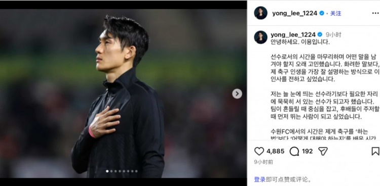 12月31日讯 39岁前韩国国脚李镕今日更新社媒,正式宣布退役。